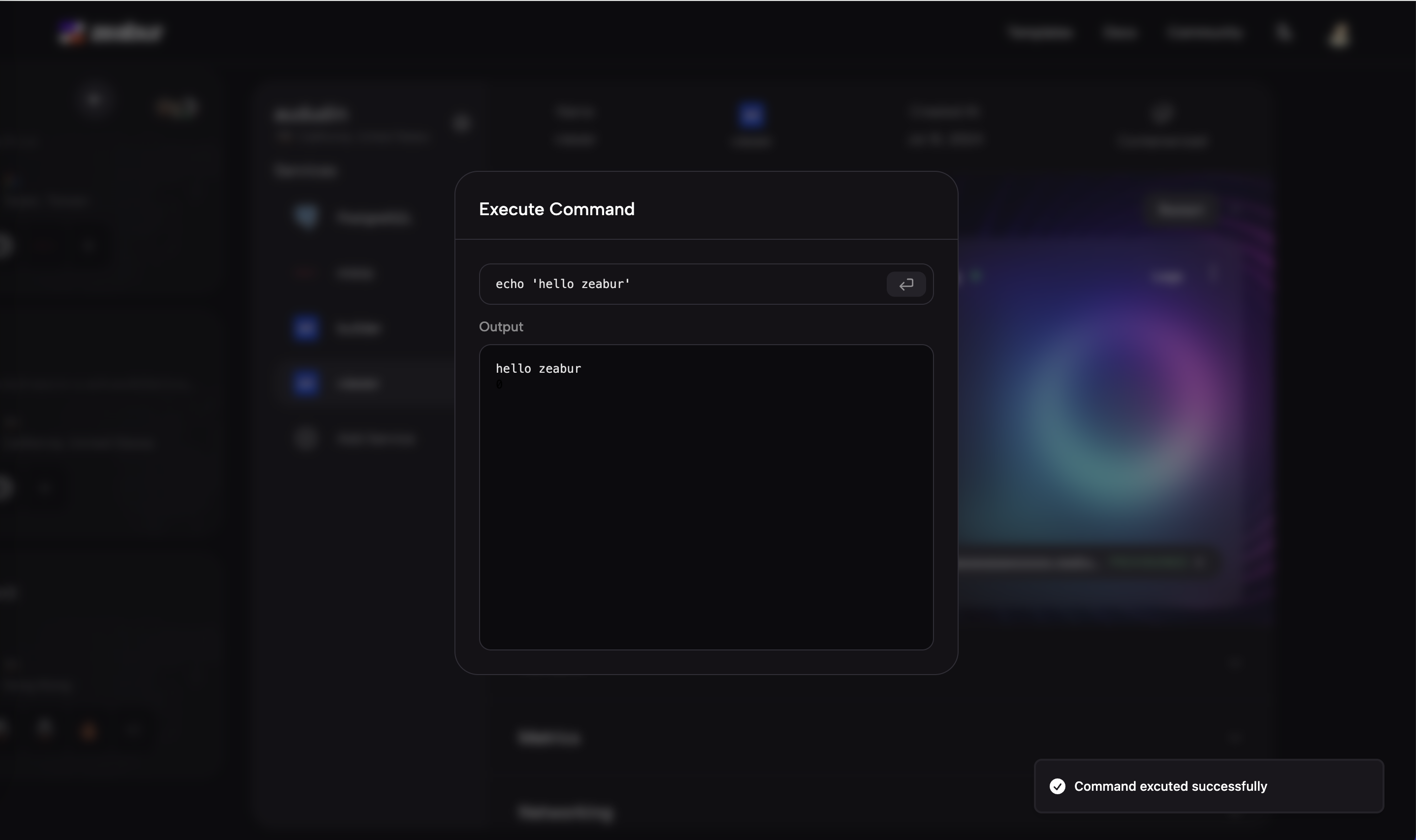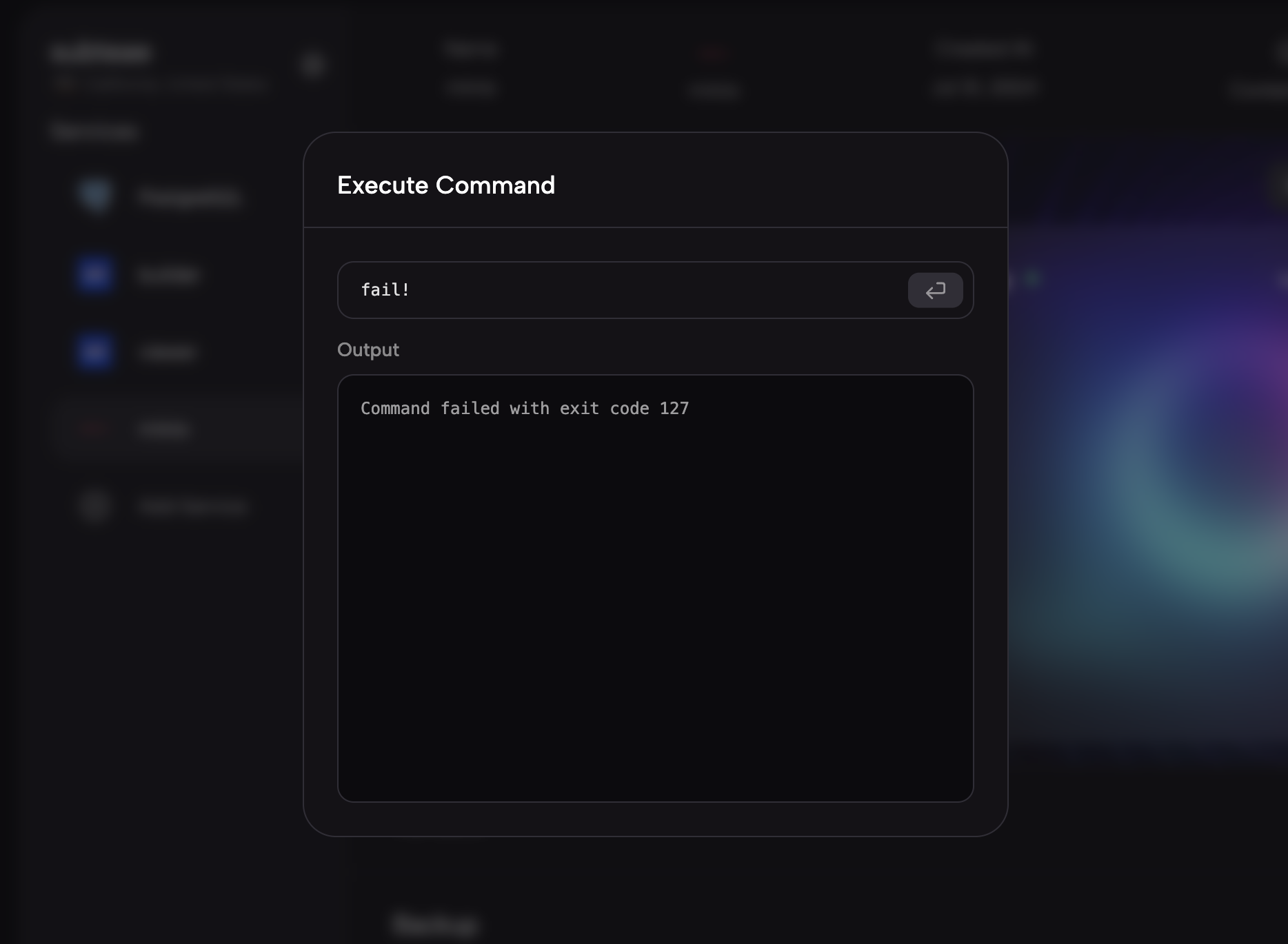 Navigate to the service page, open the menu next to "Logs" and press the Command button. You will see the command execution modal with an input bar and an output area.